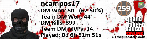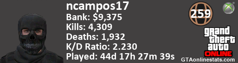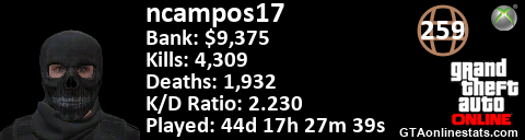 <a href="http://GTAonlinestats.com/showplayer/ncampos17"><img src="http://GTAonlinestats.com/dmsignature/ncampos17/sig.png" alt="ncampos17" border="0" /></a>