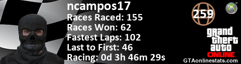 <a href="http://GTAonlinestats.com/showplayer/ncampos17"><img src="http://GTAonlinestats.com/racesignature/ncampos17/sig.png" alt="ncampos17" border="0" /></a>