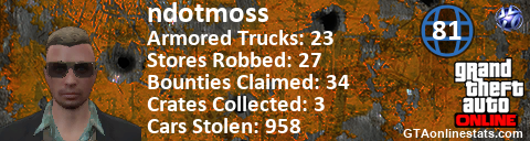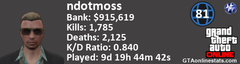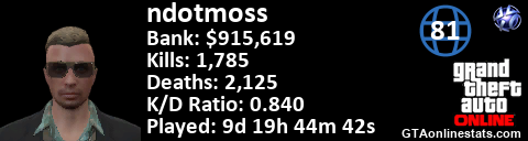 [URL=http://GTAonlinestats.com/showplayer/ndotmoss][IMG]http://GTAonlinestats.com/signature/ndotmoss/sig.png[/IMG][/URL]