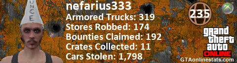 [URL=http://GTAonlinestats.com/showplayer/nefarius333][IMG]http://GTAonlinestats.com/signature/nefarius333/sig.png[/IMG][/URL]