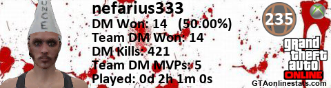[URL=http://GTAonlinestats.com/showplayer/nefarius333][IMG]http://GTAonlinestats.com/dmsignature/nefarius333/sig.png[/IMG][/URL]