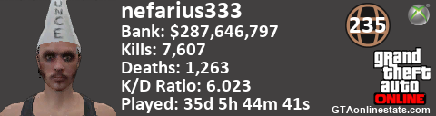 <a href="http://GTAonlinestats.com/showplayer/nefarius333"><img src="http://GTAonlinestats.com/signature/nefarius333/sig.png" alt="nefarius333" border="0" /></a>