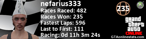 <a href="http://GTAonlinestats.com/showplayer/nefarius333"><img src="http://GTAonlinestats.com/racesignature/nefarius333/sig.png" alt="nefarius333" border="0" /></a>