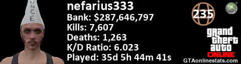 <a href="http://GTAonlinestats.com/showplayer/nefarius333"><img src="http://GTAonlinestats.com/randomsignature/nefarius333/sig.png" alt="nefarius333" border="0" /></a>