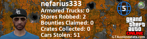 [URL=http://GTAonlinestats.com/showplayer/nefarius333/2][IMG]http://GTAonlinestats.com/randomsignature/nefarius333/2/sig.png[/IMG][/URL]