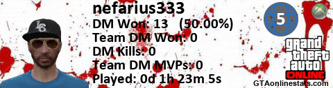 [URL=http://GTAonlinestats.com/showplayer/nefarius333/2][IMG]http://GTAonlinestats.com/dmsignature/nefarius333/2/sig.png[/IMG][/URL]
