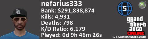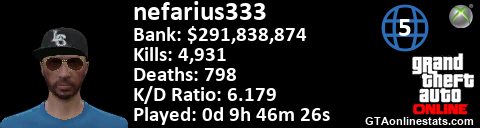 <a href="http://GTAonlinestats.com/showplayer/nefarius333/2"><img src="http://GTAonlinestats.com/dmsignature/nefarius333/2/sig.png" alt="nefarius333" border="0" /></a>