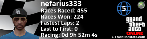 [URL=http://GTAonlinestats.com/showplayer/nefarius333/2][IMG]http://GTAonlinestats.com/racesignature/nefarius333/2/sig.png[/IMG][/URL]