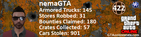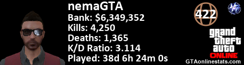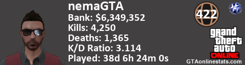 <a href="http://GTAonlinestats.com/showplayer/nemaGTA"><img src="http://GTAonlinestats.com/signature/nemaGTA/sig.png" alt="nemaGTA" border="0" /></a>
