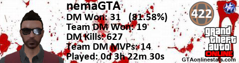 [URL=http://GTAonlinestats.com/showplayer/nemaGTA][IMG]http://GTAonlinestats.com/dmsignature/nemaGTA/sig.png[/IMG][/URL]