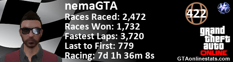<a href="http://GTAonlinestats.com/showplayer/nemaGTA"><img src="http://GTAonlinestats.com/racesignature/nemaGTA/sig.png" alt="nemaGTA" border="0" /></a>