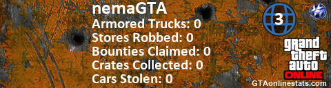 <a href="http://GTAonlinestats.com/showplayer/nemaGTA/2"><img src="http://GTAonlinestats.com/crimesignature/nemaGTA/2/sig.png" alt="nemaGTA" border="0" /></a>