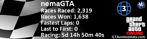 <a href="http://GTAonlinestats.com/showplayer/nemaGTA/2"><img src="http://GTAonlinestats.com/racesignature/nemaGTA/2/sig.png" alt="nemaGTA" border="0" /></a>