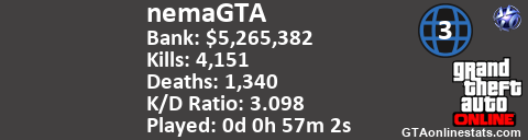 <a href="http://GTAonlinestats.com/showplayer/nemaGTA/2"><img src="http://GTAonlinestats.com/dmsignature/nemaGTA/2/sig.png" alt="nemaGTA" border="0" /></a>