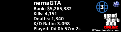 <a href="http://GTAonlinestats.com/showplayer/nemaGTA/2"><img src="http://GTAonlinestats.com/signature/nemaGTA/2/sig.png" alt="nemaGTA" border="0" /></a>
