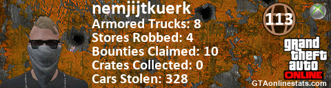 <a href="http://GTAonlinestats.com/showplayer/nemjijtkuerk"><img src="http://GTAonlinestats.com/crimesignature/nemjijtkuerk/sig.png" alt="nemjijtkuerk" border="0" /></a>