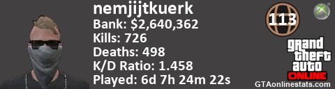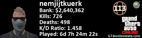 <a href="http://GTAonlinestats.com/showplayer/nemjijtkuerk"><img src="http://GTAonlinestats.com/signature/nemjijtkuerk/sig.png" alt="nemjijtkuerk" border="0" /></a>