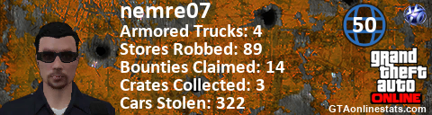 <a href="http://GTAonlinestats.com/showplayer/nemre07"><img src="http://GTAonlinestats.com/crimesignature/nemre07/sig.png" alt="nemre07" border="0" /></a>