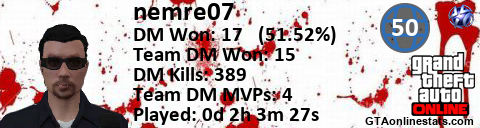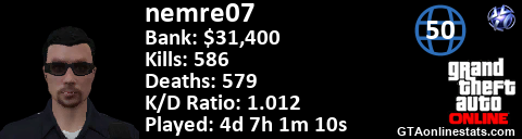 <a href="http://GTAonlinestats.com/showplayer/nemre07"><img src="http://GTAonlinestats.com/dmsignature/nemre07/sig.png" alt="nemre07" border="0" /></a>