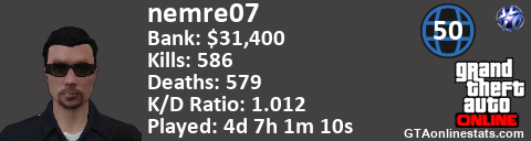 <a href="http://GTAonlinestats.com/showplayer/nemre07"><img src="http://GTAonlinestats.com/signature/nemre07/sig.png" alt="nemre07" border="0" /></a>