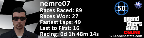 <a href="http://GTAonlinestats.com/showplayer/nemre07"><img src="http://GTAonlinestats.com/racesignature/nemre07/sig.png" alt="nemre07" border="0" /></a>