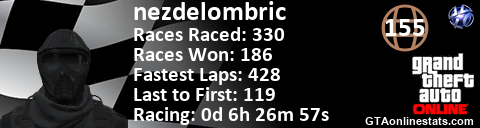 <a href="http://GTAonlinestats.com/showplayer/nezdelombric"><img src="http://GTAonlinestats.com/racesignature/nezdelombric/sig.png" alt="nezdelombric" border="0" /></a>