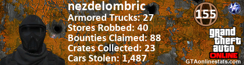 <a href="http://GTAonlinestats.com/showplayer/nezdelombric"><img src="http://GTAonlinestats.com/randomsignature/nezdelombric/sig.png" alt="nezdelombric" border="0" /></a>
