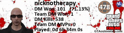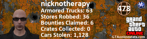 [URL=http://GTAonlinestats.com/showplayer/nicknotherapy][IMG]http://GTAonlinestats.com/dmsignature/nicknotherapy/sig.png[/IMG][/URL]