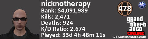<a href="http://GTAonlinestats.com/showplayer/nicknotherapy"><img src="http://GTAonlinestats.com/randomsignature/nicknotherapy/sig.png" alt="NickNoTherapy" border="0" /></a>