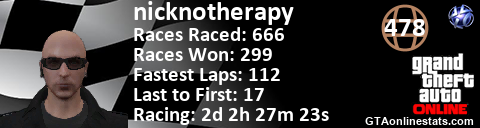[URL=http://GTAonlinestats.com/showplayer/nicknotherapy][IMG]http://GTAonlinestats.com/racesignature/nicknotherapy/sig.png[/IMG][/URL]