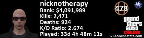 <a href="http://GTAonlinestats.com/showplayer/nicknotherapy"><img src="http://GTAonlinestats.com/dmsignature/nicknotherapy/sig.png" alt="NickNoTherapy" border="0" /></a>