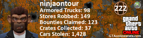 <a href="http://GTAonlinestats.com/showplayer/ninjaontour"><img src="http://GTAonlinestats.com/randomsignature/ninjaontour/sig.png" alt="ninjaontour" border="0" /></a>
