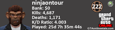 <a href="http://GTAonlinestats.com/showplayer/ninjaontour"><img src="http://GTAonlinestats.com/dmsignature/ninjaontour/sig.png" alt="ninjaontour" border="0" /></a>