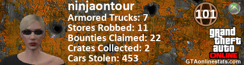 [URL=http://GTAonlinestats.com/showplayer/ninjaontour/2][IMG]http://GTAonlinestats.com/crimesignature/ninjaontour/2/sig.png[/IMG][/URL]