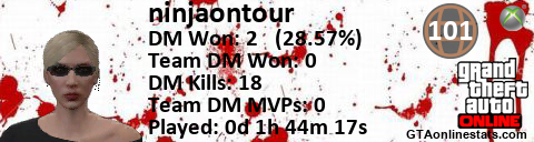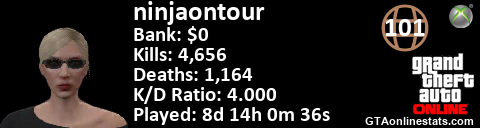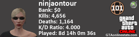 [URL=http://GTAonlinestats.com/showplayer/ninjaontour/2][IMG]http://GTAonlinestats.com/signature/ninjaontour/2/sig.png[/IMG][/URL]
