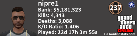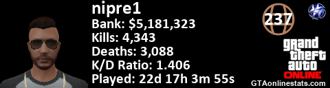 <a href="http://GTAonlinestats.com/showplayer/nipre1"><img src="http://GTAonlinestats.com/signature/nipre1/sig.png" alt="nipre1" border="0" /></a>