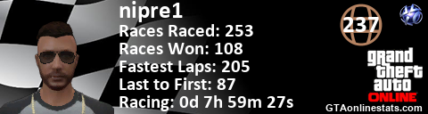 <a href="http://GTAonlinestats.com/showplayer/nipre1"><img src="http://GTAonlinestats.com/racesignature/nipre1/sig.png" alt="nipre1" border="0" /></a>