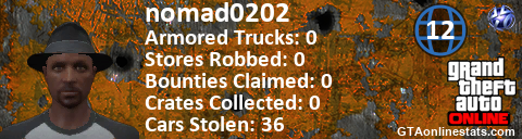 [URL=http://GTAonlinestats.com/showplayer/nomad0202/3][IMG]http://GTAonlinestats.com/crimesignature/nomad0202/3/sig.png[/IMG][/URL]