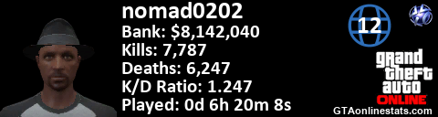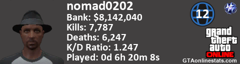 <a href="http://GTAonlinestats.com/showplayer/nomad0202/3"><img src="http://GTAonlinestats.com/signature/nomad0202/3/sig.png" alt="nomad0202" border="0" /></a>