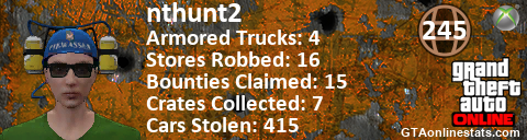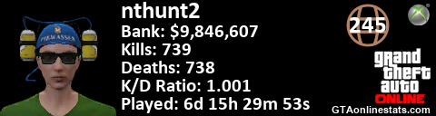 <a href="http://GTAonlinestats.com/showplayer/nthunt2"><img src="http://GTAonlinestats.com/signature/nthunt2/sig.png" alt="nthunt2" border="0" /></a>