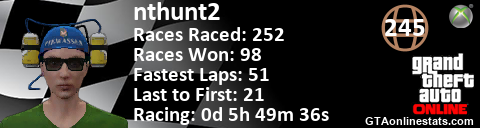 <a href="http://GTAonlinestats.com/showplayer/nthunt2"><img src="http://GTAonlinestats.com/racesignature/nthunt2/sig.png" alt="nthunt2" border="0" /></a>