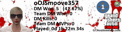 [URL=http://GTAonlinestats.com/showplayer/oOJSmoove357/2][IMG]http://GTAonlinestats.com/dmsignature/oOJSmoove357/2/sig.png[/IMG][/URL]