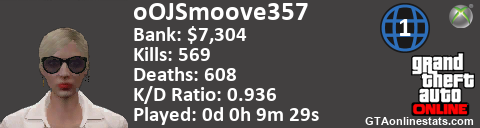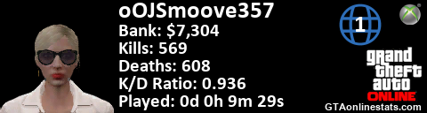 [URL=http://GTAonlinestats.com/showplayer/oOJSmoove357/2][IMG]http://GTAonlinestats.com/signature/oOJSmoove357/2/sig.png[/IMG][/URL]