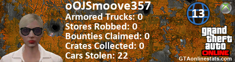 [URL=http://GTAonlinestats.com/showplayer/oOJSmoove357/3][IMG]http://GTAonlinestats.com/crimesignature/oOJSmoove357/3/sig.png[/IMG][/URL]