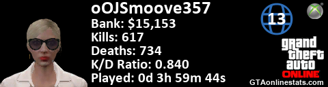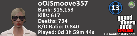 [URL=http://GTAonlinestats.com/showplayer/oOJSmoove357/3][IMG]http://GTAonlinestats.com/signature/oOJSmoove357/3/sig.png[/IMG][/URL]
