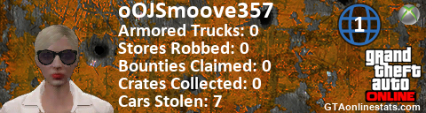 [URL=http://GTAonlinestats.com/showplayer/oOJSmoove357/4][IMG]http://GTAonlinestats.com/crimesignature/oOJSmoove357/4/sig.png[/IMG][/URL]