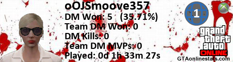 [URL=http://GTAonlinestats.com/showplayer/oOJSmoove357/4][IMG]http://GTAonlinestats.com/dmsignature/oOJSmoove357/4/sig.png[/IMG][/URL]