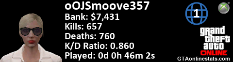 <a href="http://GTAonlinestats.com/showplayer/oOJSmoove357/4"><img src="http://GTAonlinestats.com/dmsignature/oOJSmoove357/4/sig.png" alt="oOJSmoove357" border="0" /></a>