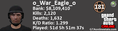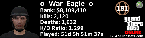 <a href="http://GTAonlinestats.com/showplayer/o_War_Eagle_o"><img src="http://GTAonlinestats.com/signature/o_War_Eagle_o/sig.png" alt="o_War_Eagle_o" border="0" /></a>