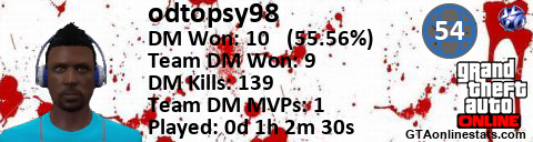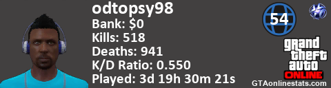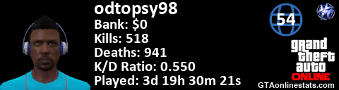 <a href="http://GTAonlinestats.com/showplayer/odtopsy98"><img src="http://GTAonlinestats.com/signature/odtopsy98/sig.png" alt="odtopsy98" border="0" /></a>